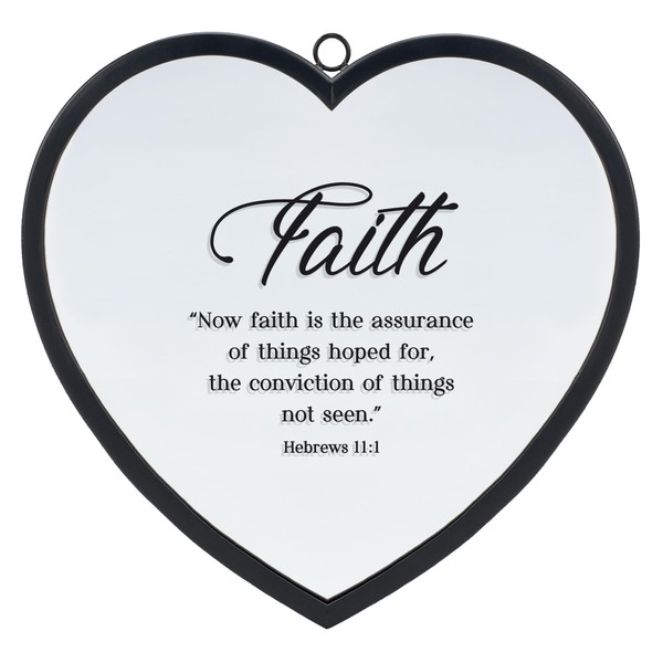 - Heart shaped mirror features sentiment reading "Faith 'Now Faith is the assurance of things hoped for, the conviction of things not see.' Hebrews 11:1"