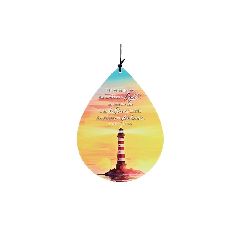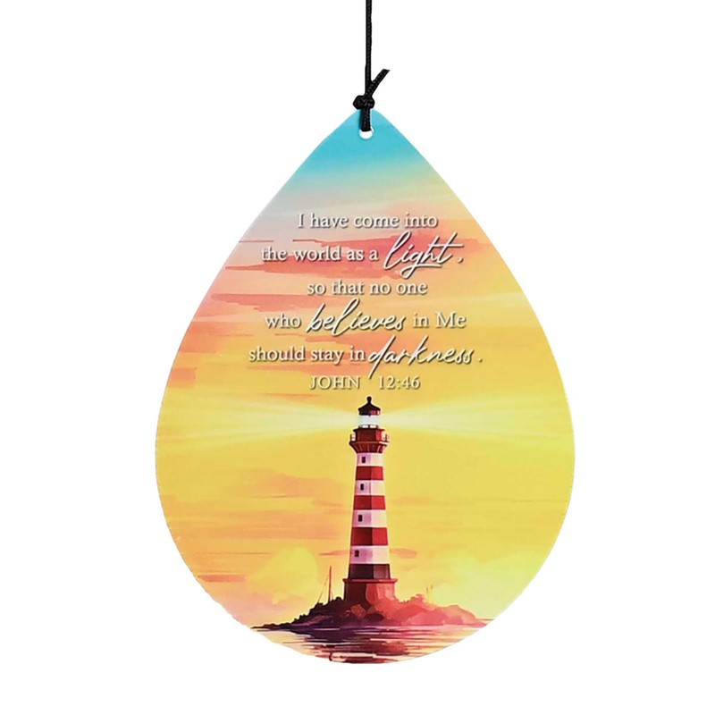 - Teardrop-shaped sail features a lighthouse at sunset with 'John 12:46: I have come into the world as a light, so that no one who believes in Me should stay in darkness'