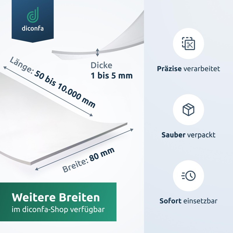 - Selection: PVC mat / PVC strips 80 mm (0.08 m) wide - thickness: 3 mm - length: 50 mm (0.05 m) - choose the required dimensions via "material" (thickness) / "size" (length).