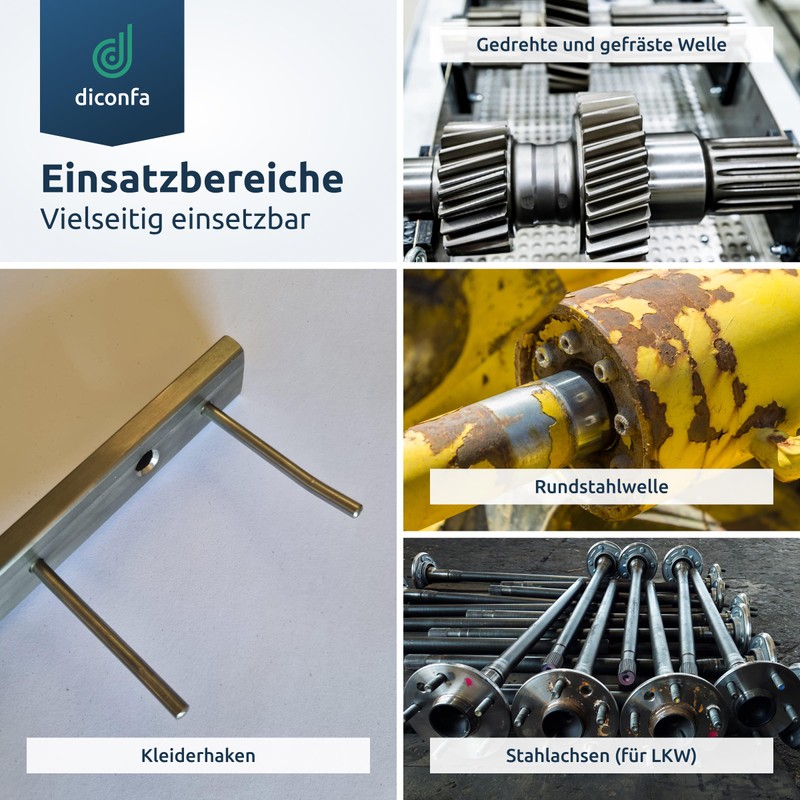 - Areas of application: machine and plant construction, construction site, DIY, crafts, locksmith work, model making, spare part (bolts + axle, etc.) e.g. construction machinery, tractors, trailers, trucks, construction, industry