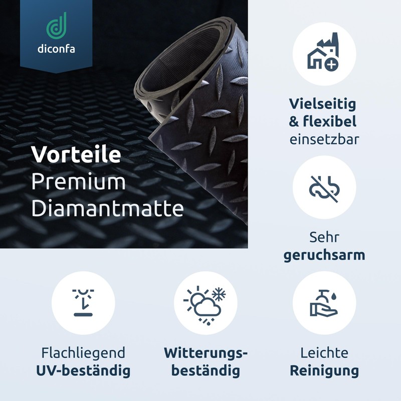- Premium rubber mat: diamond teardrop mat 3 mm thick – width: 0.2 m (200 mm – length: 0.6 m (600 mm – the desired dimensions can be changed via "size" (width) and "pattern" (length).