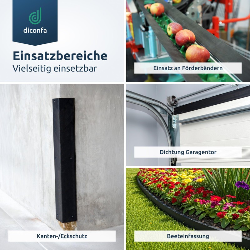 - Functions: The diconfa rubber profiles can be used for industry, logistics, trade and private use (e.g. underlay, pad, decoupling, insulation, sound protection, damping, seals etc.)