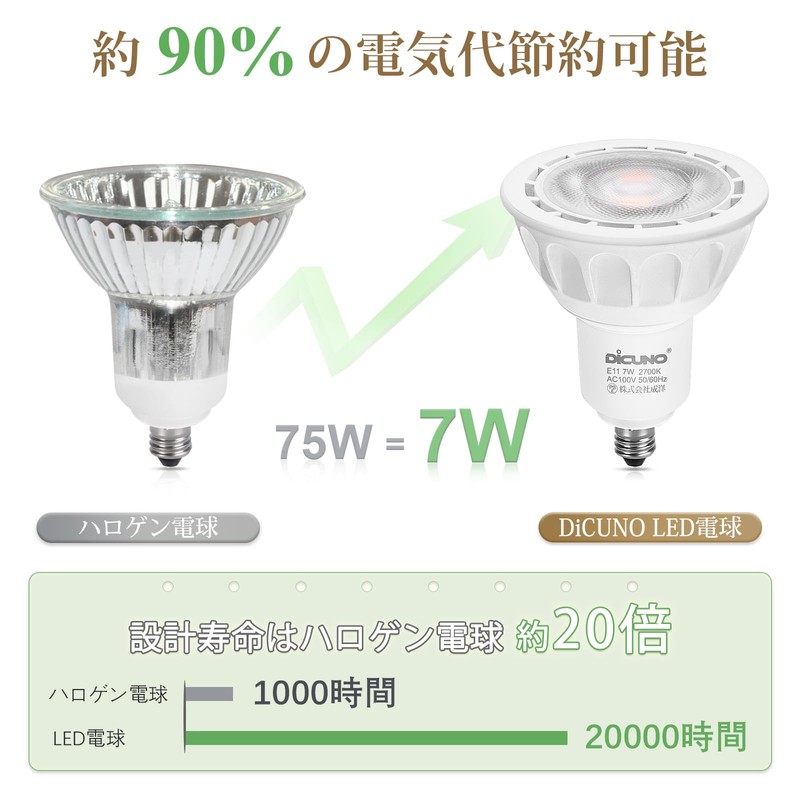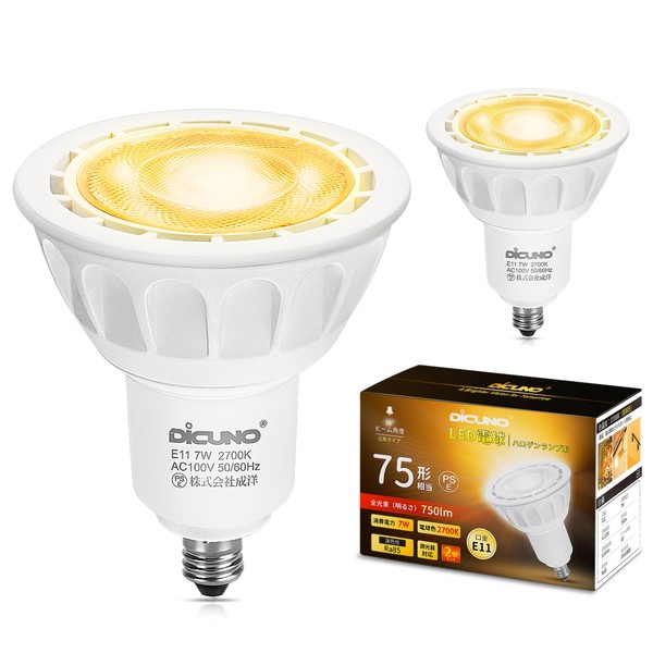 DiCUNO LED Bulb, E11 Base, Spotlight, 7W 75W Halogen Bulb Equivalent, 2700K, 750lm, Dimmable, LED Spotlight, Wide Angle, High Brightness, AC100V, PSE Certified, White, Pack of 2