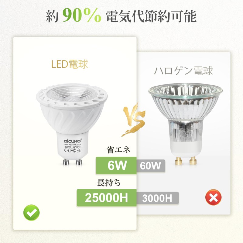 DiCUNO LED Bulb, GU10 Base, Spotlight, 6W, 60W Halogen Equivalent, 600lm, Bulb Color, 3000K, AC100-240V, Non-Dimmable, Pack of 6