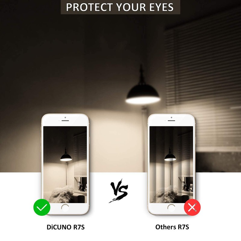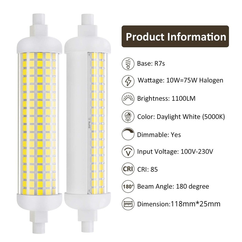 - Bright light: DiCUNO R7s 10 W LED lamp emits cool white light of 5000 K and 1100 LM, brighter than most other R7s LED lamps with similar lighting angle of 180°. This R7S LED has a total of 108 LED chips concentrated on one side of the LED. No waste of light energy. Save 90% on energy and electricity costs. Produces less heat and lasts longer than halogen bulbs (ideal lifespan: 15000 hours).