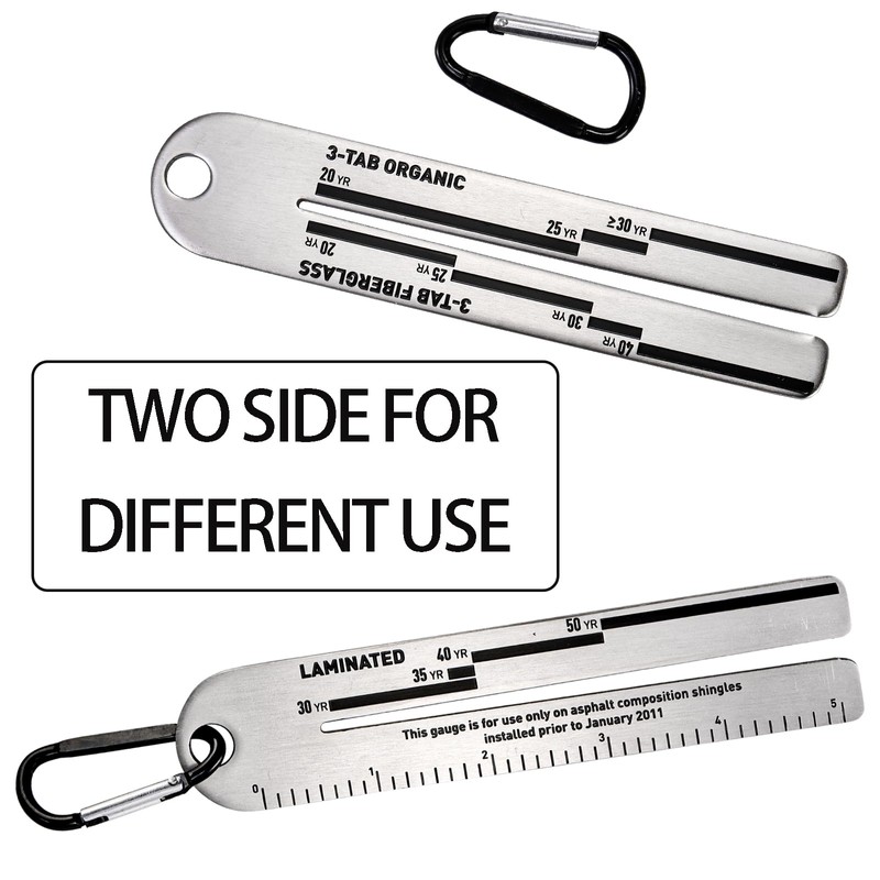 - Package: 2 pc shingle gauges. Size: 5.9" L x 1.3" W. Scale on the shingle gauge: 3-Tab Fiberglass, 3-Tab Organic, Laminated. And the roof shingles measuring tool has a 5-inch ruler on one side.