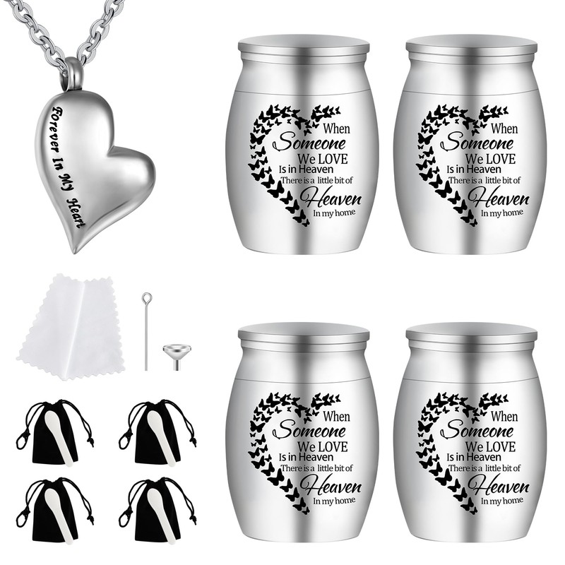 - HANDMADE: These unique 4 small urns and 1 human ashes necklace will cherish your unique relationship with your loved one. Each memorial urn is approximately 1.57 inches tall and holds approximately 2 cubic inches of ashes. All 4 Stainless Steel Cremation Boxes and 1 Necklace Ash Keepsake Urn are handmade and small negligible differences may occur as part of the quality of a handmade product.