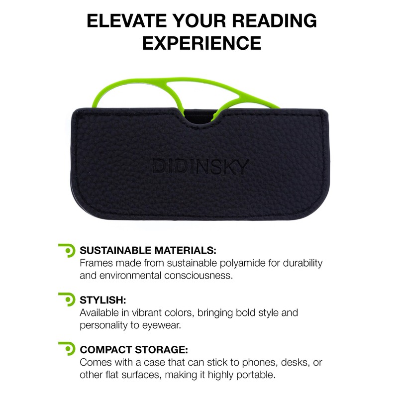 Didinsky Prado armless reading glasses redefine how and where you read. Designed in Barcelona by professional opticians, these rimless presbyopia glasses feature a revolutionary, temple-free design that provides comfortable, pressure-free wear throughout the day. Whether you're at home, in the office, or on the go, these lightweight eyeglasses for women and men make it easy to focus when and where you need to. Crafted to eliminate the discomfort of traditional frames, these portable glasses rest securely on the bridge of your nose without placing pressure on your ears or temples. The result is a minimal reading aid that’s featherlight yet highly effective. These pocket glasses are ideal for quick tasks like reviewing text messages, reading menus, or scanning documents, especially for those managing presbyopia who want a sleek, modern solution. Available in a range of diopters, each lens is coated with anti-scratch and anti-reflective treatments to reduce glare and maintain clarity over time. The flexible eyeglasses for men and women adjust naturally to different nose shapes, offering a snug yet comfortable fit without slipping. And thanks to their durability, they retain their shape with use after use. What makes Didinsky Prado truly unique is its portability. These pocket readers come with an ultra-thin, semi-leather case featuring a double-sided adhesive backing. Attach it to your phone, tablet, laptop, or notebook so your eyeglasses are always within reach. With a soft plush interior, the case protects your lenses from dust and scratches—ideal for commuting, traveling, or working remotely. From readers for the office to readers for your phone, Didinsky Prado delivers stylish function in a compact form. Colorful, fashionable, and compact, the Didinsky Prado is an essential everyday accessory for readers who value both function and design. Whether you're on the move or relaxing at home, these travel reading glasses are always ready to support your vision.