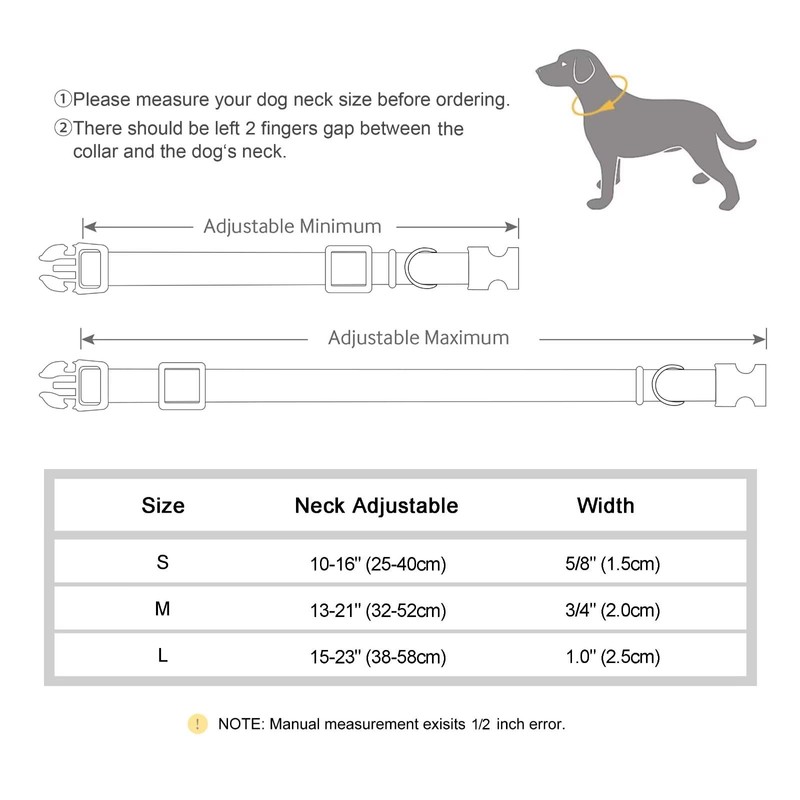 - SIZE ATTENTION: Pls carefully measure your dog neck size first and leave 2 figures, then refer to the size chart when purchase. We sincerely hope you could take the correct size collar home