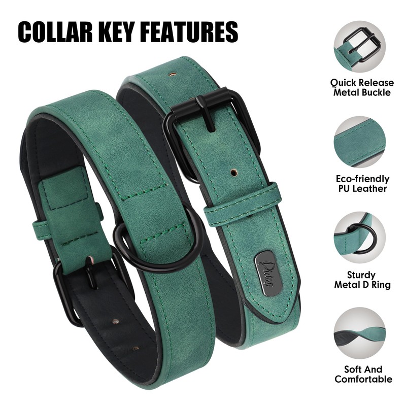 Didog Soft Padded Leather Dog Collar, Breathable, Durable Leather Dog Collar with Adjustable, Rustproof Metal Buckle for Medium and Large Dogs, Green, L