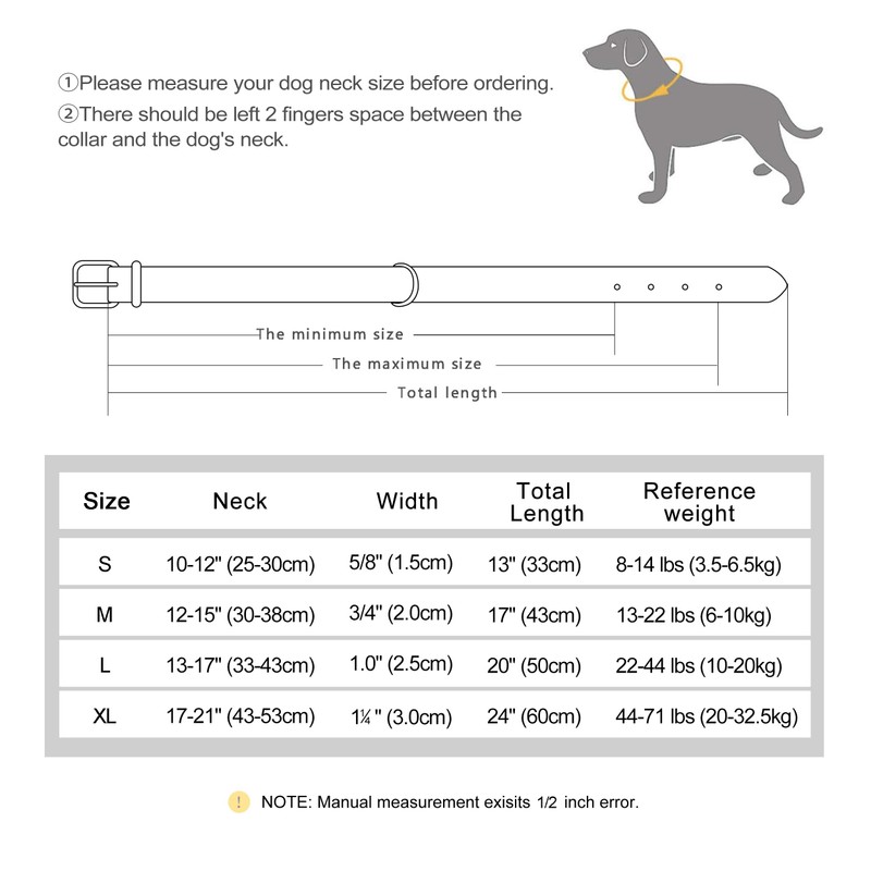 Note: Your pets usually wear S size, does not mean that all S sizes fit it. Please carefully refer to the size chart and make sure you measure the dog's neck size for 2 fingers before purchasing. then choose the right one for your dogs.