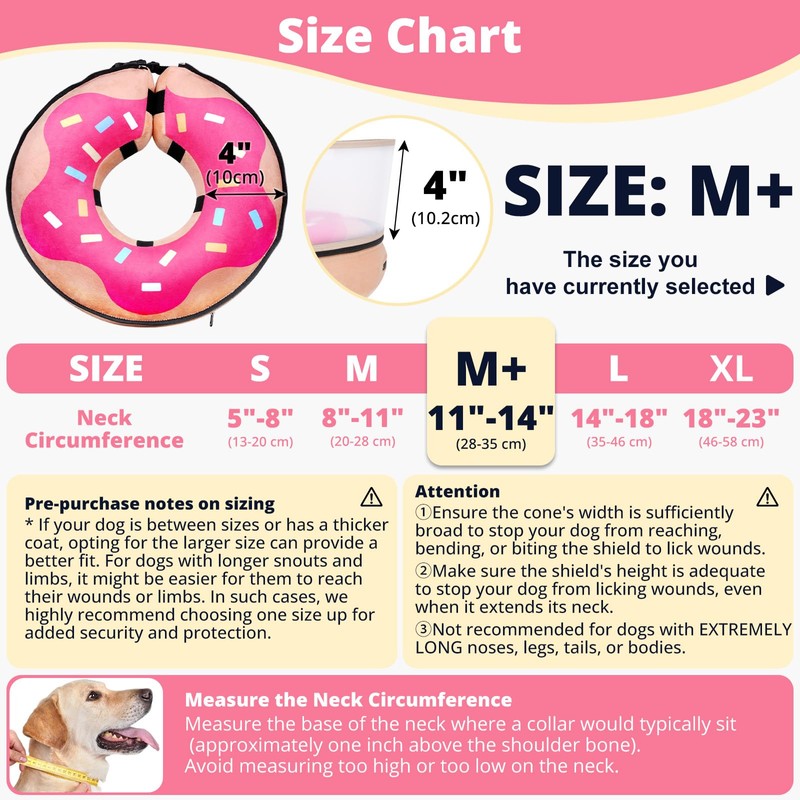 • Select the Appropriate Size: M+ (Neck Girth:11"-14", Shield's height:4", Cone's Width:4"). Before purchasing, ensure you measure your dog's neck circumference and the distance from neck to nose. Order the next size up if your dog falls between measurements. Ensure the inflatable dog cone extends beyond your dog’s mouth to prevent it from biting or accessing the wound. Not suitable for heavy chewers with very long noses, legs, tails or bodies, such as Great Dane