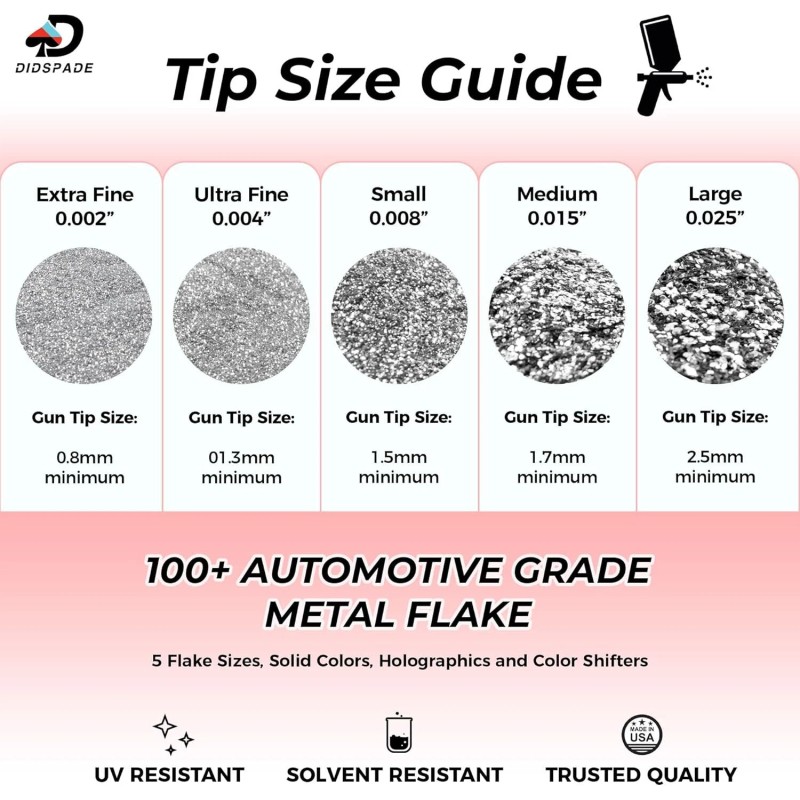 - Experience the excellence of Didspade, a trusted brand in the industry known for supplying the highest quality flake available. Our premium flake is proudly made in the USA using quality materials, ensuring superior performance for your automotive paint projects. With a temperature resistance up to 350°F, our flake is solvent and UV resistant, as well as colorfast, fade resistant, and solvent resistant. Choose Didspade for exceptional quality and results that shine with excellence.