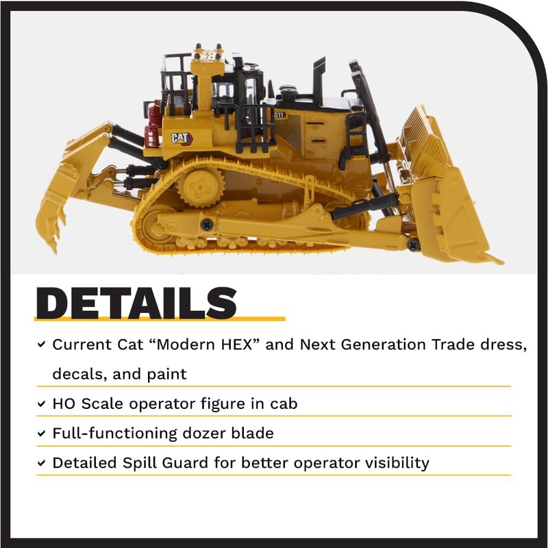 - Auténtica réplica de escuadra con detalles destacados: el diseño TKN de escala HO de Caterpillar D11 de Caterpillar de última generación incluye pintura precisa de Caterpillar "Modern Hex" de próxima generación, calcomanías y vestido comercial y una figura de operador de escala HO dentro de la cabina. La gran hoja de excavadora de hoja en U en la parte delantera del tractor tiene perforaciones de visibilidad en la parte superior del protector de derrames y se mueve hacia arriba y hacia abajo, ángulos hacia adelante y hacia atrás. Un desgarrador funcional de tres vástagos está montado en la parte posterior del tractor.