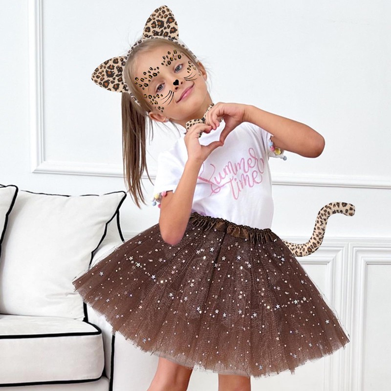 - Leopard costume accessories: you will receive 1 x leopard ears headband, 1 x leopard tie, 1 x leopard tail, 1 x brown 3-layer tulle skirt, 1 x leopard face art sticker. They can help you complete role play easily, meet your clothing needs and are a great decoration for your holiday parties.