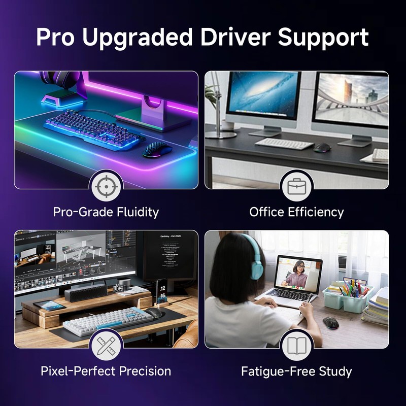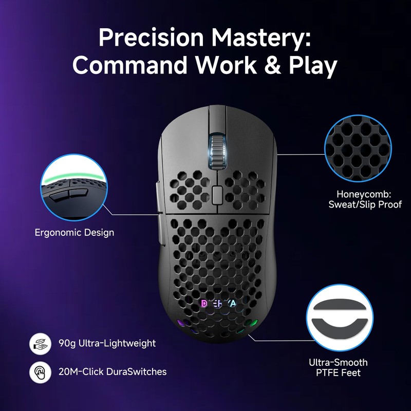 • Ergonomic and Lightweight Build:Weighing only 90 grams, this mouse features a symmetrical mid-size shell (125×63×41mm) with a sweat-resistant honeycomb texture to improve grip. Suitable for all grip styles including claw, palm, and fingertip. The Huano micro switches are rated for 20 million clicks, paired with smooth PTFE feet for effortless movement.