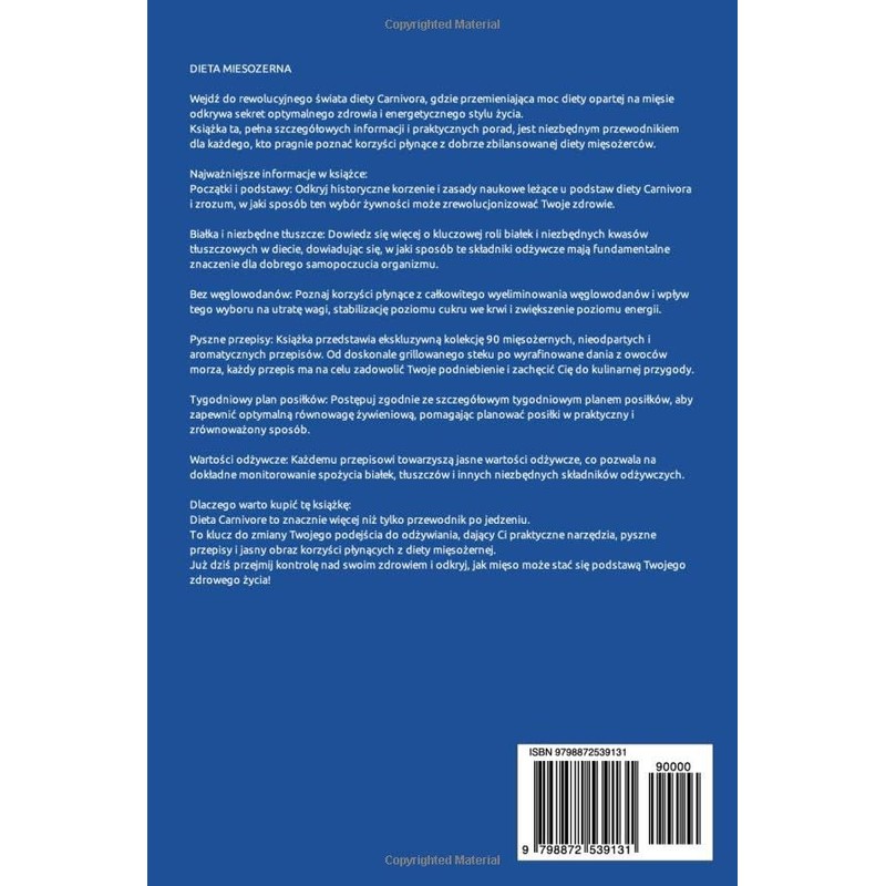 DIETA MIESOZERNAWejd? do rewolucyjnego ?wiata diety Carnivora, gdzie przemieniaj?ca moc diety opartej na mi?sie odkrywa sekret optymalnego zdrowia i energetycznego stylu ?ycia.Ksi??ka ta, pe?na szczeg?owych informacji i praktycznych porad, jest niezb?dnym przewodnikiem dla ka?dego, kto pragnie pozna? korzy?ci p?yn?ce z dobrze zbilansowanej diety mi?so?ercw.Najwa?niejsze informacje w ksi??ce:Pocz?tki i podstawy: Odkryj historyczne korzenie i zasady naukowe le??ce u podstaw diety Carnivora i zrozum, w jaki sposb ten wybr ?ywno?ci mo?e zrewolucjonizowa? Twoje zdrowie.Bia?ka i niezb?dne t?uszcze: Dowiedz si? wi?cej o kluczowej roli bia?ek i niezb?dnych kwasw t?uszczowych w diecie, dowiaduj?c si?, w jaki sposb te sk?adniki od?ywcze maj? fundamentalne znaczenie dla dobrego samopoczucia organizmu.Bez w?glowodanw: Poznaj korzy?ci p?yn?ce z ca?kowitego wyeliminowania w?glowodanw i wp?yw tego wyboru na utrat? wagi, stabilizacj? poziomu cukru we krwi i zwi?kszenie poziomu energii.Pyszne przepisy: Ksi??ka przedstawia ekskluzywn? kolekcj? 90 mi?so?ernych, nieodpartych i aromatycznych przepisw. Od doskonale grillowanego steku po wyrafinowane dania z owocw morza, ka?dy przepis ma na celu zadowoli? Twoje podniebienie i zach?ci? Ci? do kulinarnej przygody.Tygodniowy plan posi?kw: Post?puj zgodnie ze szczeg?owym tygodniowym planem posi?kw, aby zapewni? optymaln? rwnowag? ?ywieniow?, pomagaj?c planowa? posi?ki w praktyczny i zrwnowa?ony sposb.Warto?ci od?ywcze: Ka?demu przepisowi towarzysz? jasne warto?ci od?ywcze, co pozwala na dok?adne monitorowanie spo?ycia bia?ek, t?uszczw i innych niezb?dnych sk?adnikw od?ywczych.Dlaczego warto kupi? t? ksi??k?:Dieta Carnivore to znacznie wi?cej ni? tylko przewodnik po jedzeniu.To klucz do zmiany Twojego podej?cia do od?ywiania, daj?cy Ci praktyczne narz?dzia, pyszne przepisy i jasny obraz korzy?ci p?yn?cych z diety mi?so?ernej.Ju? dzi? przejmij kontrol? nad swoim zdrowiem i odkryj, jak mi?so mo?e sta? si? podstaw? Twojego zdrowego ?ycia!Przewi w gr? i kliknij przycisk ?Kup teraz jednym klikni?ciem!