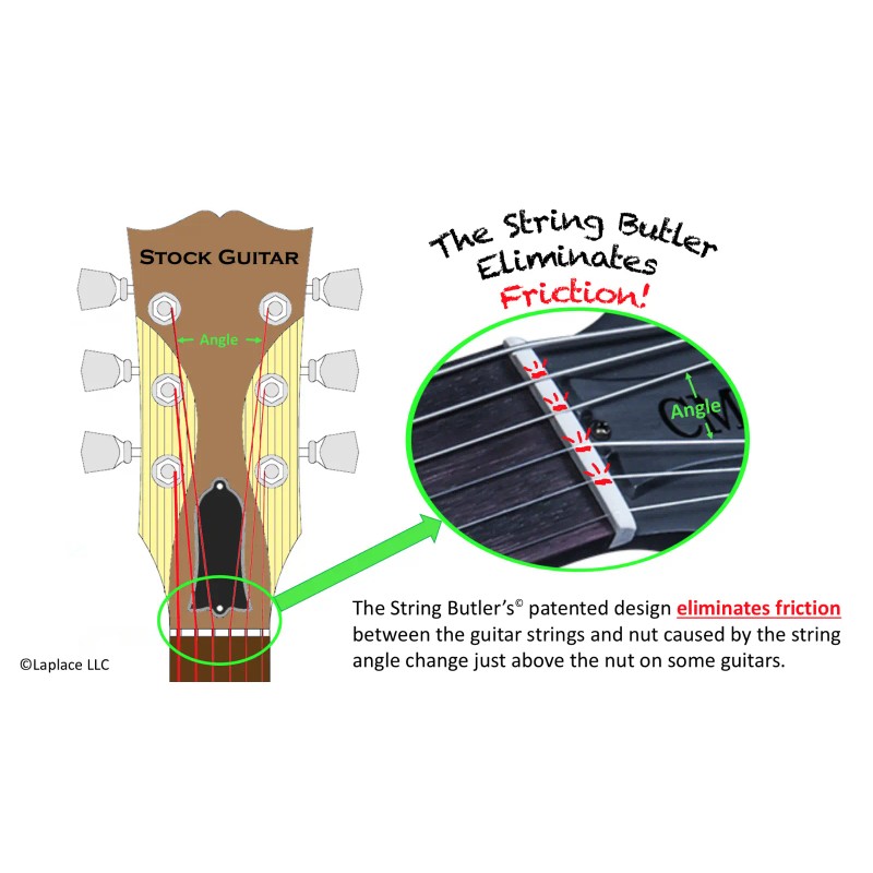 - The String Butler’s Patented Design attaches to the head of your guitar and corrects the angle of the strings as they pass through the nut.