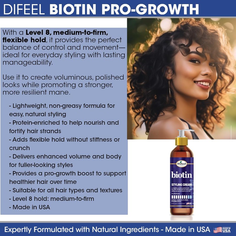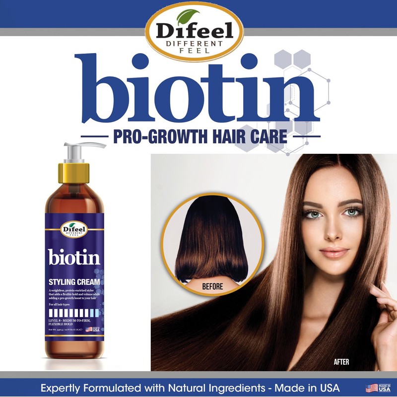 - BIOTIN CREAM FOR HAIR - Difeel Biotin Styling Cream is a weightless, protein-enriched formula designed to deliver flexible hold, boosted volume, and a healthy dose of pro-growth nourishment.