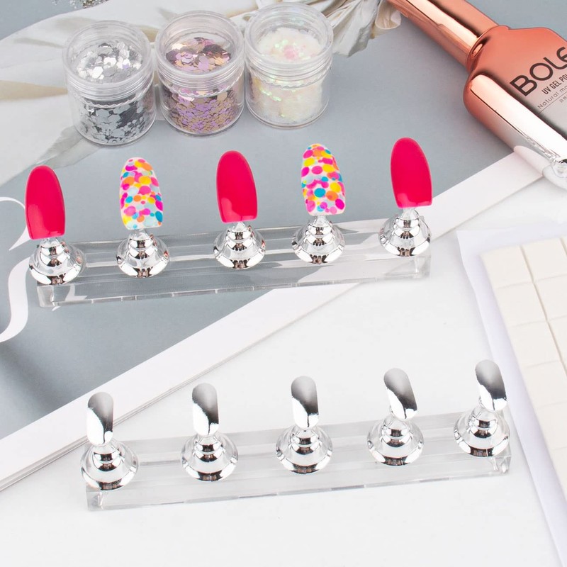 - Great Value Sets: package includes 2 sets of acrylic silver nail display holders (1 set of nail display tool including 5 nail tips and 1 acrylic practice stand base)and 54pcs white reusable adhesive putty, quantity sufficient for your nail design decoration and practice needs