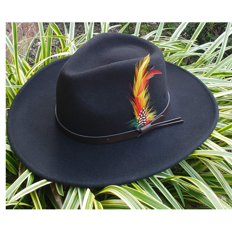 - Features : 3" Wide Brim , 5" High Crown , Faux Leather Band With Removable Feather Accent .