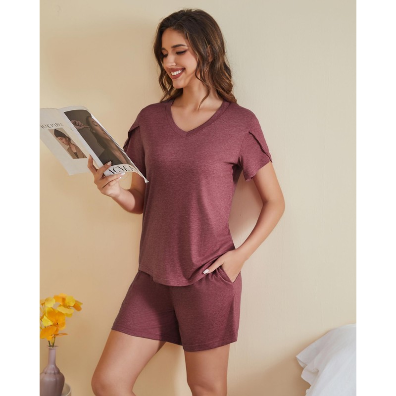difficort Pajamas for Women Two Piece Lounge Set Petal Short Sleeve Top and Shorts PJ,Maroon,Small