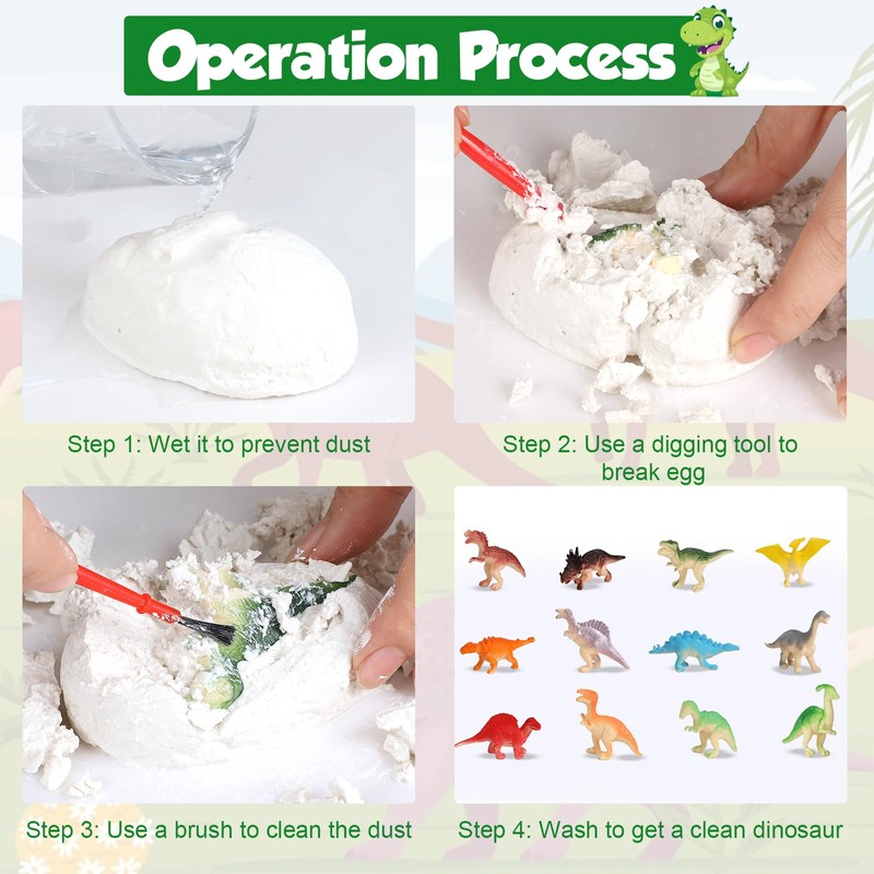 The digging eggs are made of safe plaster and will loosen slightly when exposed to water. Various dinosaurs are hidden inside waiting to be discovered, such as Tyrannosaurus Rex, Triceratops, Euoplocephalus, etc. Digging isn't difficult, but it takes time and patience, and digging out all the dinosaur is challenging and rewarding enough. Pwsap Kids' Dinosaur Digging Kit is perfect for sharing with family, friends, students or classmates.