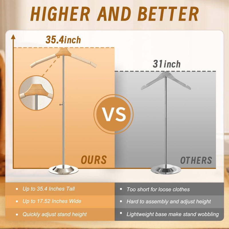 - Adjustable Height: 20 up to 35 inch tall, upgraded higher shirt stand can perfectly display all season free size or oversized clothes of all sizes. You can adjust height by rotate the knob in 5 second as your need