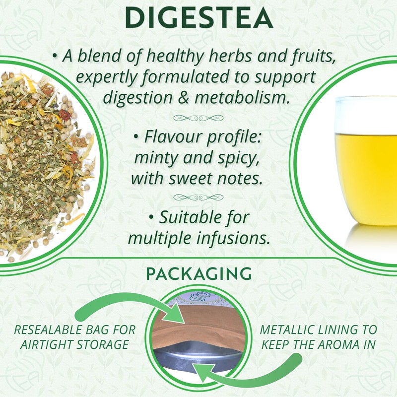 - ABOUT: Our Digestea loose herbal tea is a blend of herbs and fruits that has been specially formulated to support digestion and metabolism. We are sure you will enjoy its taste too!