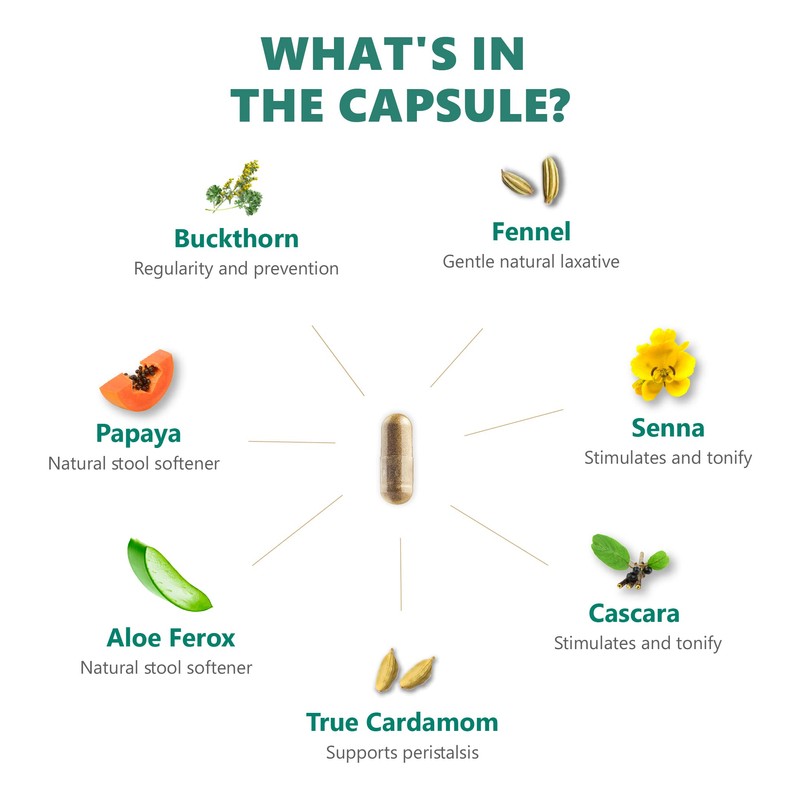 • 100% NATURAL INGREDIENTS : Carica Papaya, Aloe Ferox, Cassia Angustifolia, Rhamnus Frangula, Rhamnus Purshiana (Cascara sagrada), Elettaria Cardamome, Foeniculum Vulgare. All-natural herbal formula to ease digestion, regulate metabolism, relieve the symptoms of constipation, and most importantly help strengthen and support the digestive system.