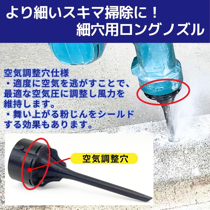- Long nozzle for fine holes: Outer diameter 0.3 inches (8.5 mm), Inner diameter (hole diameter) 0.2 inches (4 mm), Total length 5.9 inches (150 mm)): Convenient for cleaning the bottom holes of small anchors. Compatible with Makita Blower Instead of the manufacturer's standard nozzle, the long nozzle for the fine hole is inserted directly into the blower body. Blows away concrete clogged in the anchor hole in a tornado breeze. Snoop on local dust. Also useful for cleaning sash grooves and thin skimas, and blowing away fine debris at once