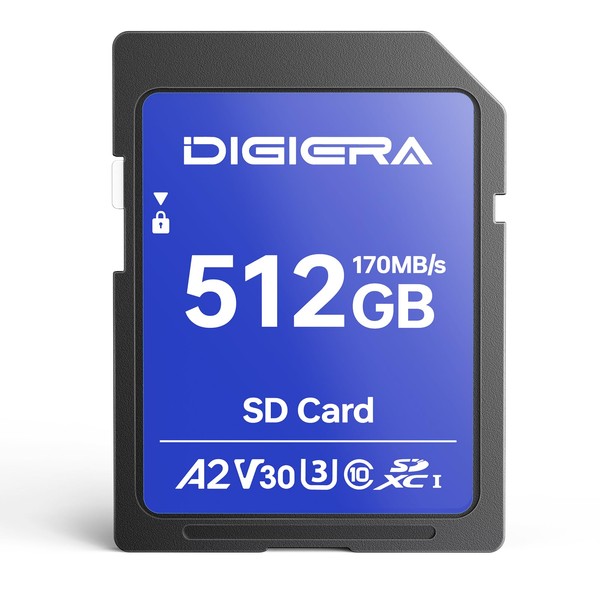 - Professional-Grade Video Recording: Rated C10, V30, and U3, the DIGIERA 512GB SD card supports smooth 4K UHD video recording with zero interruptions. It’s perfect for photographers, extreme sports enthusiasts, and travel bloggers, enabling them to capture dynamic shots and manage high-resolution content effortlessly