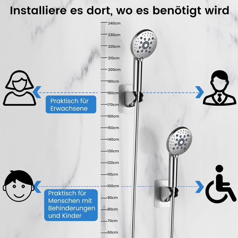 • ??Super Power Sticky Base??Unser Duschhalter verf??gt ??ber eine gro?e Basis von 92??68mm, die eine verbesserte Wandhaftung und Stabilit?t bietet. Der starke Kleber verhindert, dass die Halterung herunterf?llt und stellt sicher, dass der Duschkopf sicher an seinem Platz bleibt, ohne eine Gefahr f??r Ihre Familie oder den Handbrausekopf selbst darzustellen.