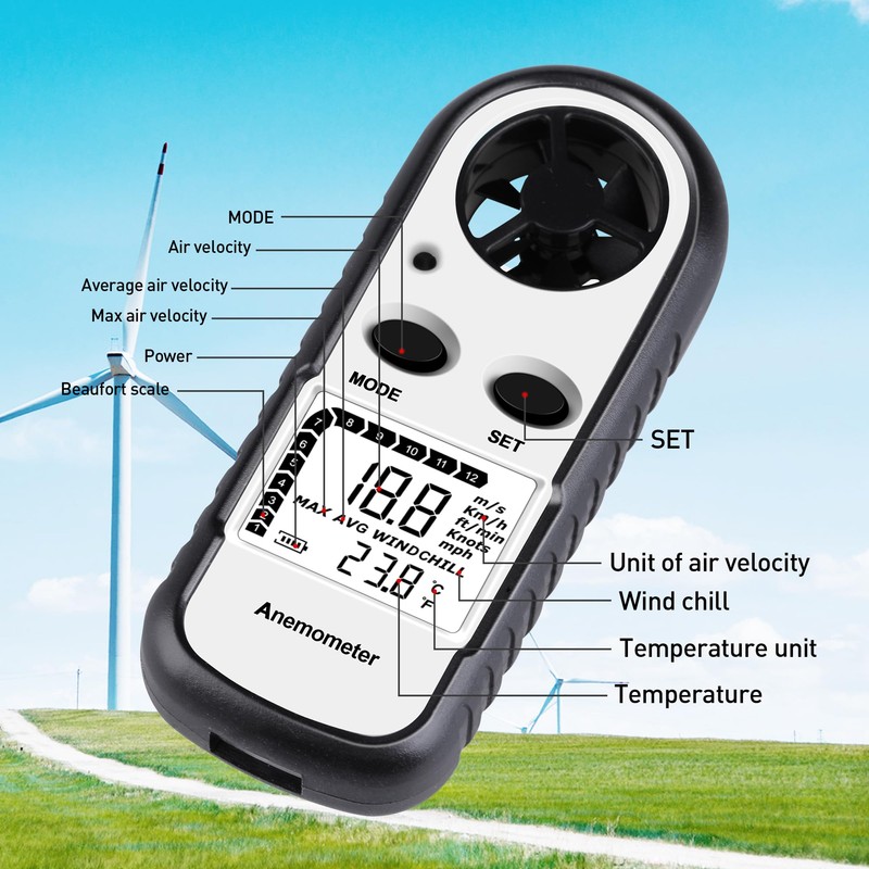 - đ©ăMULTIFUNCTION WIND METERăâ: designed to measure wind speed (0-30 m/s, 0-5860 ft/min, 0-55 knots, 0-90 km/hr, 0-65 mph) with 12 level beaufort scales, and detect air temperature ( 14°F and 113°F), easy to switch â/â units by press the button with no tools, support wind chill indication, display Max/ Average/ Current air velocity on LCD screen in real time, more convenient than 2 buttons anemometer.