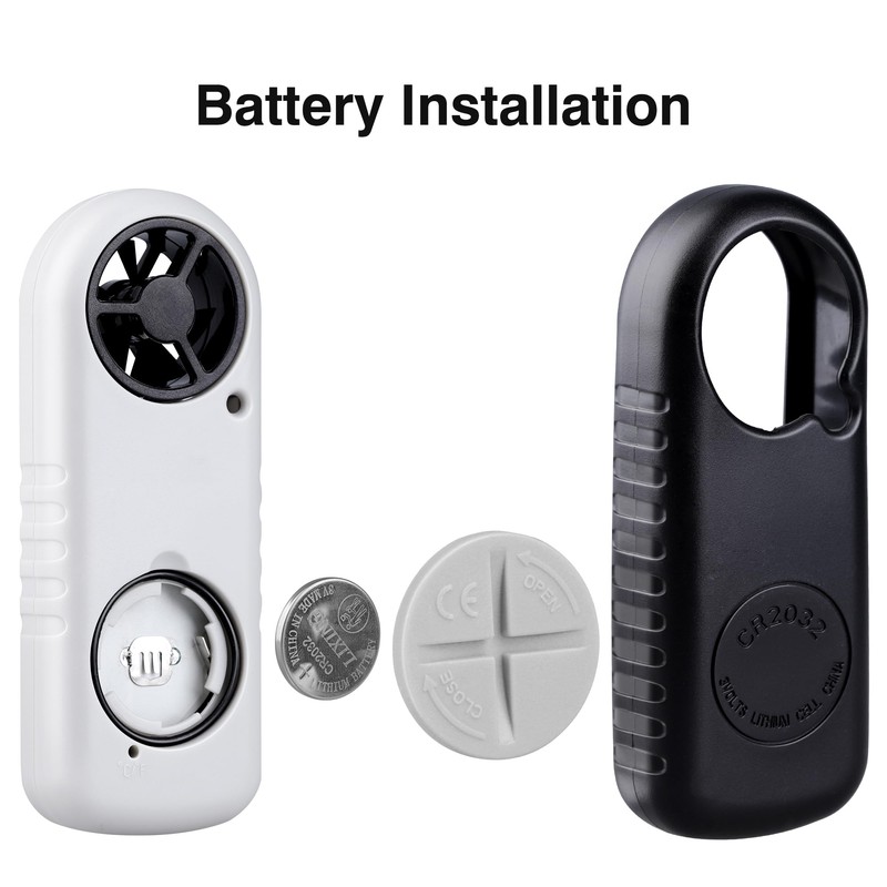 - đăEASY TO INSTALL BATTERY & USEăâRemove off the yellow rubber protector cover, then open the battery door, it's more easier than other wind meter gauge. Put a CR2032 battery (included), turn on windspeed anemometer by press âModeâ for 2s to measure wind and analyze environment to do activities.