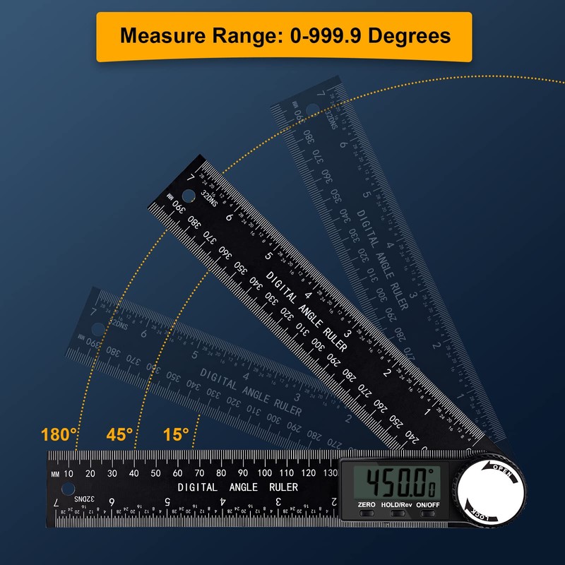 - đăWidely UsedăThis digital angle finder can measure length and angle (metric and imperial), and is widely used in woodworking furniture, building materials decoration, school, home DIY, mechanical processing, drawing and other fields such as making angle cuts, measurements trim, wall angle measuring, measure for cornices, skirting, alcoves, flooring etc.