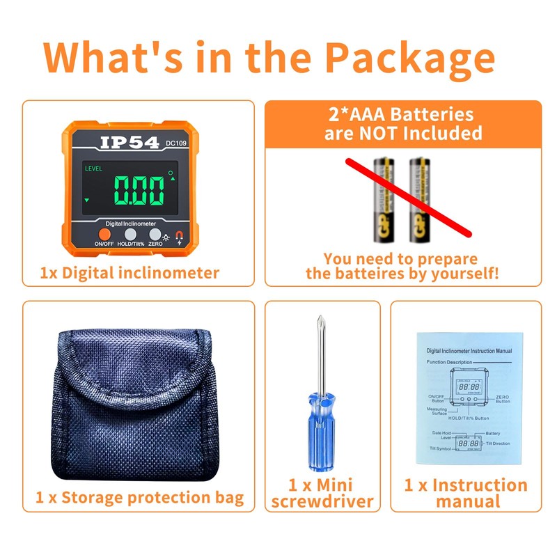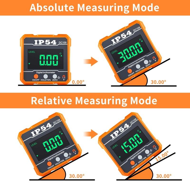 - Portable & Durable:This compact digital angle finder is designed for ease of use and portability, making it an essential tool for on-site measurements. It collaborates well with other measuring tools and operates effectively in tight spaces. With a temperature range from 14°F to 122°F (-10°C to 50°C) and IP55 dust and IP54 water-resistant ratings, it's built to withstand a variety of environmental conditions
