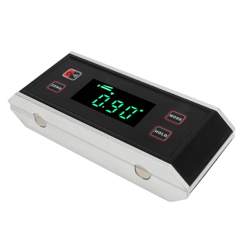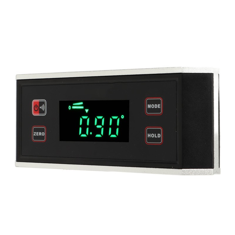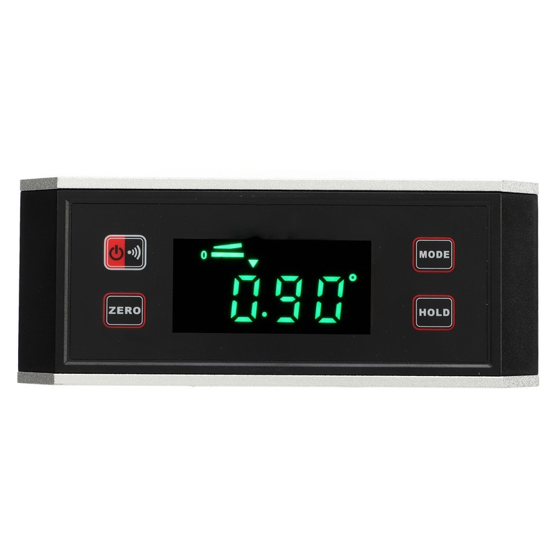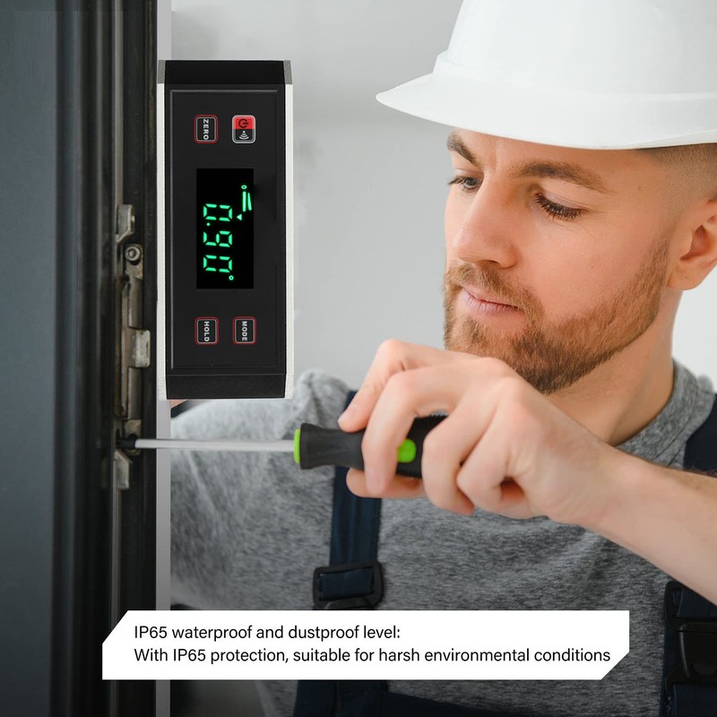 1、V GROOVE MAGNETIC BASE: Digital angle gauge's magnetic V groove base can be firmly connected to black metal surfaces such as pipelines, steel structure frames, metal manufacturing, etc. 2、ABSOLUTE AND RELATIVE MEASUREMENT: Digital angle finder has an absolute angle measurement function, which can test whether the working surface is on a horizontal plane to check roof slope, wheel alignment, etc. In addition, the magnetic horizontal plane can be used to check the relative angle between surfaces. 3、LCD SCREEN: Digital protractor has a large backlit LCD screen. Regardless of the light, you can easily read the measurement results. When the electronic level is inverted, the displayed value will automatically reverse. When you arrive 0 ° or 90 °, sound signals are emitted through a beep sound. 4、IP65 WATERPROOF AND DUSTPROOF: With IP65 protection, this inclinometer is suitable for harsh environmental conditions. The battery cover and other highly sealed structural designs ensure good operation in environments with splashing water and dust. 5、WIDE APPLICATION: Digital inclinometer is suitable for decoration, woodworking, architecture, masonry, machinery, automobiles, etc.