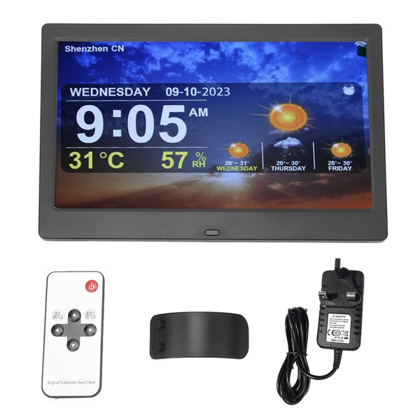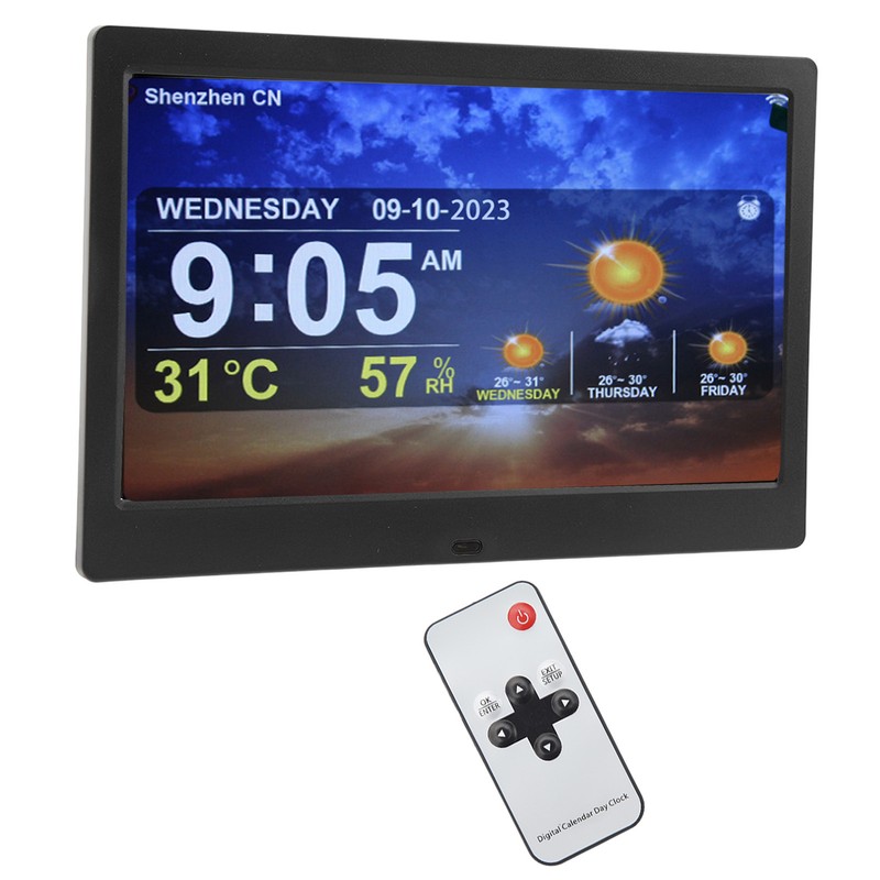 1、Best Clock for the Elderly: HD 10 inch digital alarm clock clearly writes the date and week as well as the time display, but also shows that day outdoor temperature, humidity, airflow quality and positioning as well as the weather forecast, shows the weather conditions for 3 days, predict the weather cold and warm, maximize to help the elderly get up and start the day. 2、5 Sets of Alarm Times: Multiple alarms allow you to organize your time more clearly. There are also options for different mode prompts, a single 30 second alarm and a repeat 60 second alarm, which is a great help for seniors with dementia or Alzheimer's disease. 3、WiFi Intelligent Update: The clock automatically identifies the city after connecting to WiFi, and updates the date, time and temperature and humidity intelligently. It automatically updates once every hour, automatically eliminates errors, and ensures the time is very accurate. 4、Remote Control: Press the remote control settings to enter the setting interface, press the remote control play button for 3 seconds, you can switch your favorite clock interface, there are eight interfaces to choose from. 5、Support Photo Music Video Uploading: You can insert the storage card or USB flash drive (not included) to play pictures, background music or video, not support picture and video mixing. 6、Automatic Dimming: From 7:00 PM, the brightness will be automatically adjusted to low light, so as to prevent dazzling eyes and affect sleep at night. Equipped with desktop bracket, suitable for the living room, bedroom, study, dining room desk, etc.