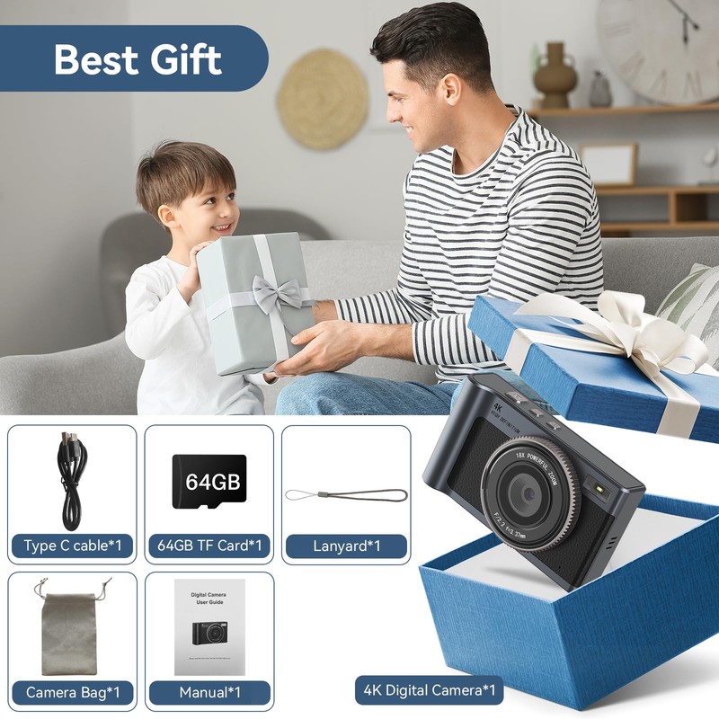 - PERFECT GIFT FOR CHRISTMAS AND BIRTHDAYS - Package includes: digital camera with a rechargeable lithium battery and 64GB SD card assembled; USB-C cable, user manual, storage bag, lanyard. You can get started easily. Not only suitable for personal use, but also a perfect Christmas gift and birthday gift for kids, teens, kids, beginners and family.