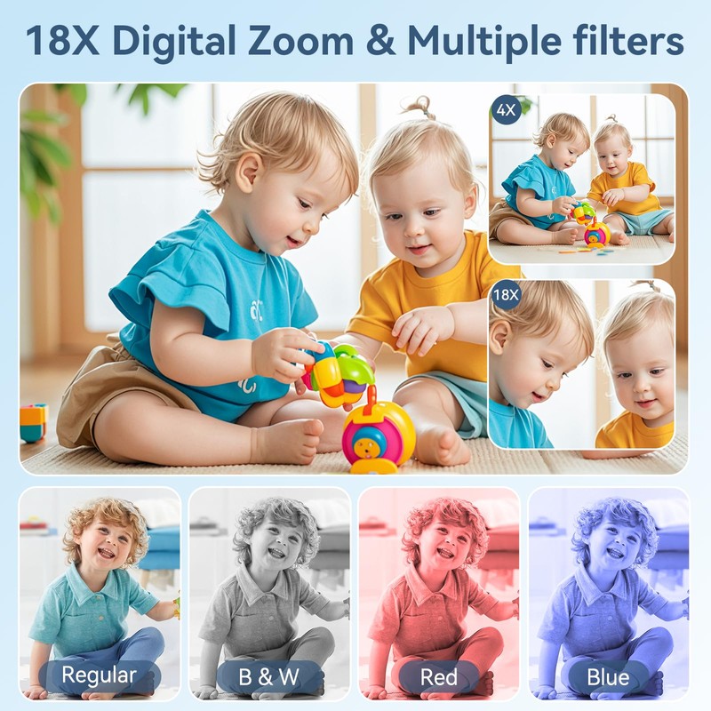 - 【18X Zoom Camera with IPS Display】2.8 inch IPS screen shows a clear image. This digital camera supports 16x digital zoom, you can easily extend and zoom out by pressing the W/T button. The HD camera is also equipped with a high-brightness flash to capture clear images in dark environments. (Note: This is a digital zoom, not an optical zoom, and all digital zooms affect the image quality when zooming, the more you zoom the more blurry it gets)
