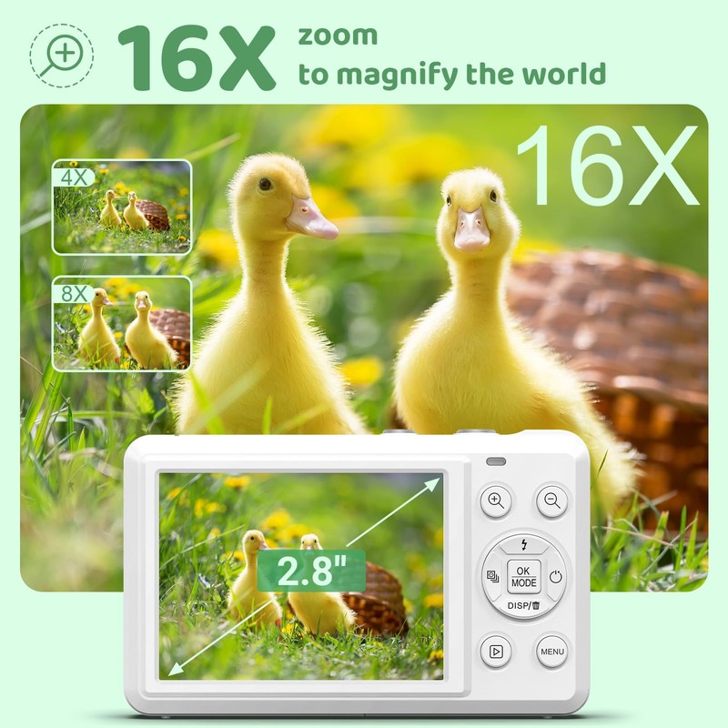 • 🔍 Auto Focus & 16X Digital Zoom - Enjoy crystal-clear shots with the Point and Shoot digital camera’s auto-focus feature. Perfect for both distant views and close-ups, the 16X digital zoom ensures every shot is detailed and sharp. Macro mode lets you get as close as 10cm, ideal for capturing the smallest details on your adventures.