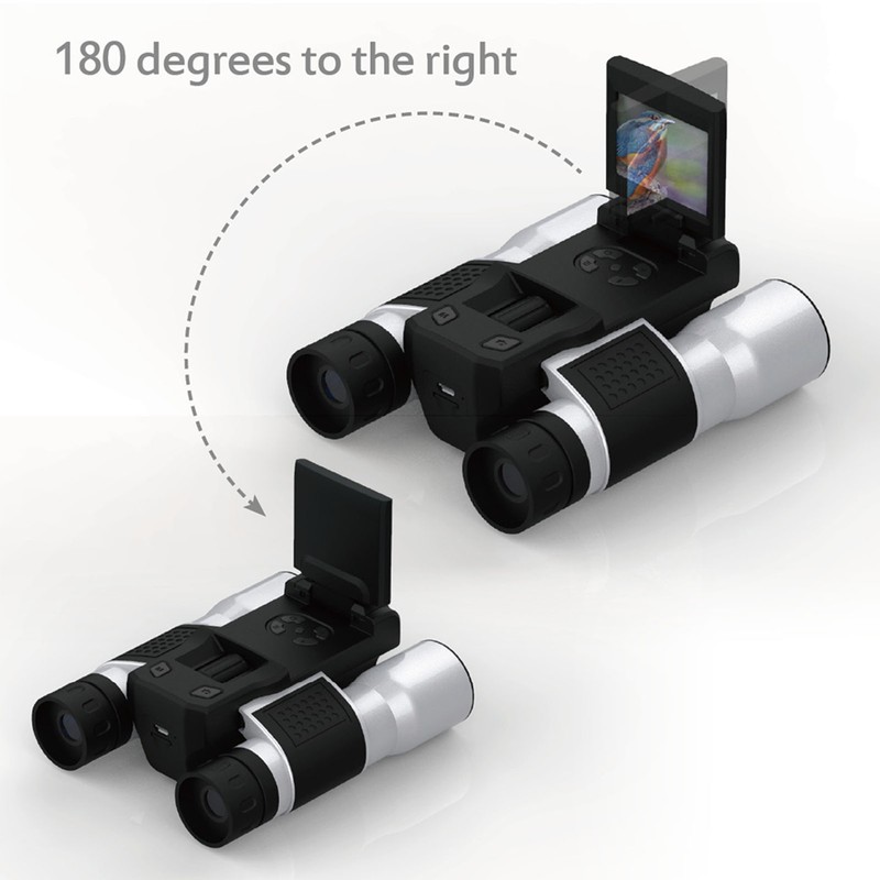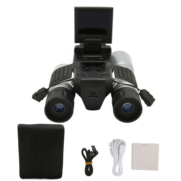 1、2 IN 1 DESIGN: Digital binocular camera combines optical binoculars and digital video camera in a perfect combination. 12x optical zoom provides you with a longer field of view, you can catch what you see at a distance, video and images and save them to the memory card of the digital binocular camera. (memory card,support up to 64GB,not included) 2、2 INCH HD DISPLAY: The digital binocular camera has a 2 inch HD display that supports rotation, you can rotate in any direction to adjust the angle to view the screen without dead angle. Easily view catched videos and photos. 3、12x32mm LARGE OBJECTIVE LENS: Binoculars with 12x high magnification and 32mm wide angle lens design. A clearer view in the distance and better catch of the observed objects. It is a helper for hiking and bird watching.96m field of view at 1000m. 4、SUPER BRIGHT HD LENS: Superior 32mm full multilayer lens provides brighter field of view and clearer images. Catch HD video up to 1920X1080P and UHD photos up to 12M (4032X3024) resolution. 5、LARGE CAPACITY RECHARGEABLE BATTERY: Built in 900mAh large capacity rechargeable battery can last for about 210 minutes of video. Date and time can be printed in the image or video. Supports sound recording when recording videos. 6、WIDE RANGE OF USES: Can be used for observing distant places, taking photos and videos from a long distance, hunting, fishing, bird watching, outdoor adventures, surveillance work, watching concerts or sports matches, villa, manor, farm, factory burglary prevention, astronomical and meteorological observation and so on. 7、LIGHTWEIGHT AND PORTABLE DESIGN: The telescope has a female threaded tripod mount, which can be used to attach to a standard tripod or attach an additional IR light. Comes with lanyard and storage bag, can be carried around, perfect for outdoor travel.