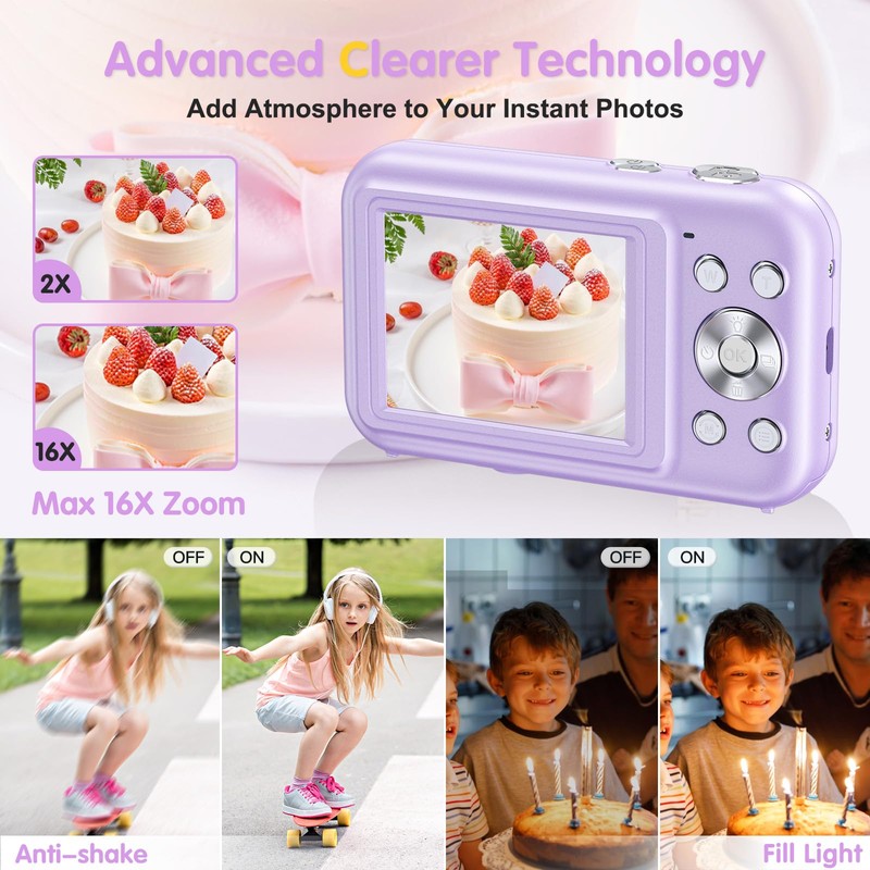 - 📸𝐂𝐚𝐩𝐭𝐮𝐫𝐞 𝐕𝐢𝐯𝐢𝐝 𝐏𝐡𝐨𝐭𝐨𝐬 & 𝐕𝐢𝐝𝐞𝐨: The digital camera uses the latest CMOS metering system and LCD true color screen, which can shoot FHD 1080P videos and 44MP photos, presenting natural colors. To make it easier for beginners and kids to use, purple point and shoot digital cameras has added anti-shake function and fill light, which can capture relatively clearer videos or photos in the dark and sports. 16X digital zoom adds fun, and the instant shutter can capture in 1S!