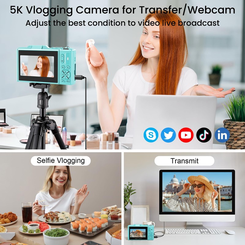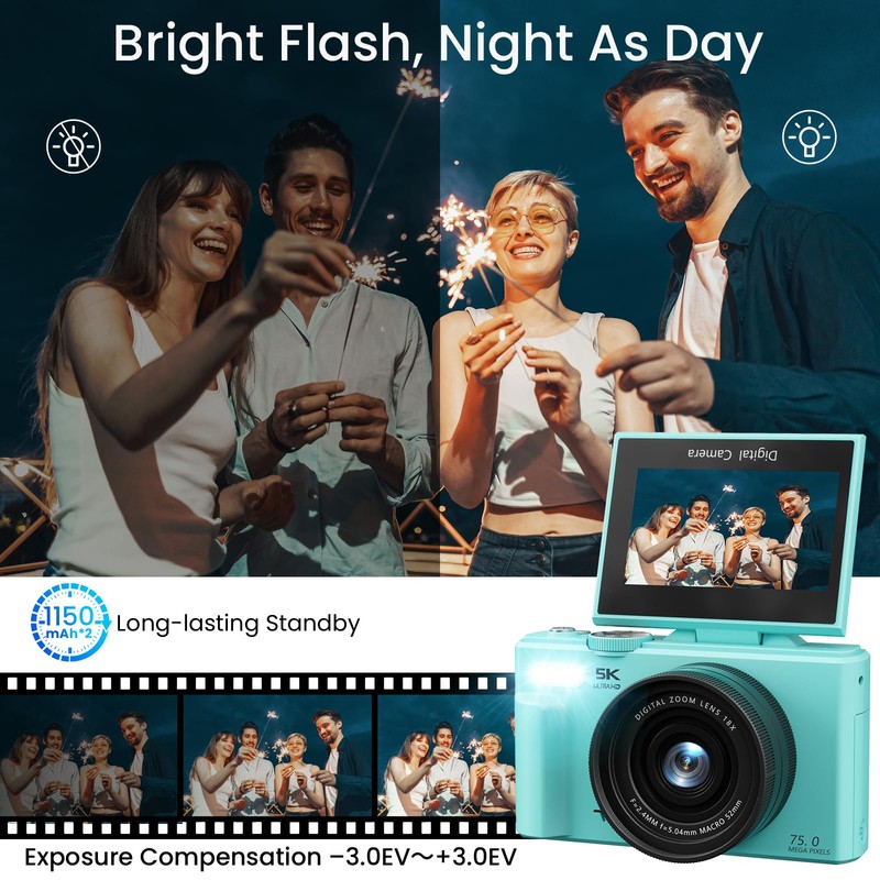 - UHD 5K and 75MP Digital Camera: The vlogging camera for Youtube can take 75MP images and record videos with 5K . The 3 inch ultra-clear screen supports 180° flip, which is easy for selfies and making self-blogging. The digital camera adds selfie, video pause function, recording while charging, slow motion recording and continuous shooting, which is better than traditional cameras.