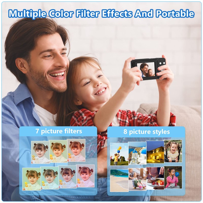 • 【Multifunctional Digital Camera】This digital camera for kids with 44MP picture pixels will help you capture ultra-high-definition images, and record smoother videos with FHD 1080P video resolution. This compact digital camera for kids has tons of color filter effects, allowing kids to see the world in different colors through the camera viewfinder and create fun photos. The point-and-shoot camera has a face detection feature that automatically captures smiling faces.