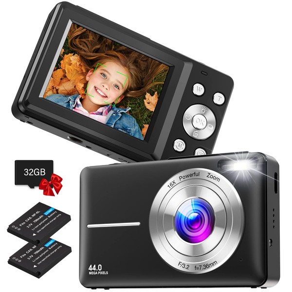 Digital Camera, Nsoela FHD 1080P 44MP Kids Camera with 32GB Card, Compact Point and Shoot Camera, 16X Digital Zoom Vlogging Camera, Portable Mini Kids Camera for Teens Students (Black)