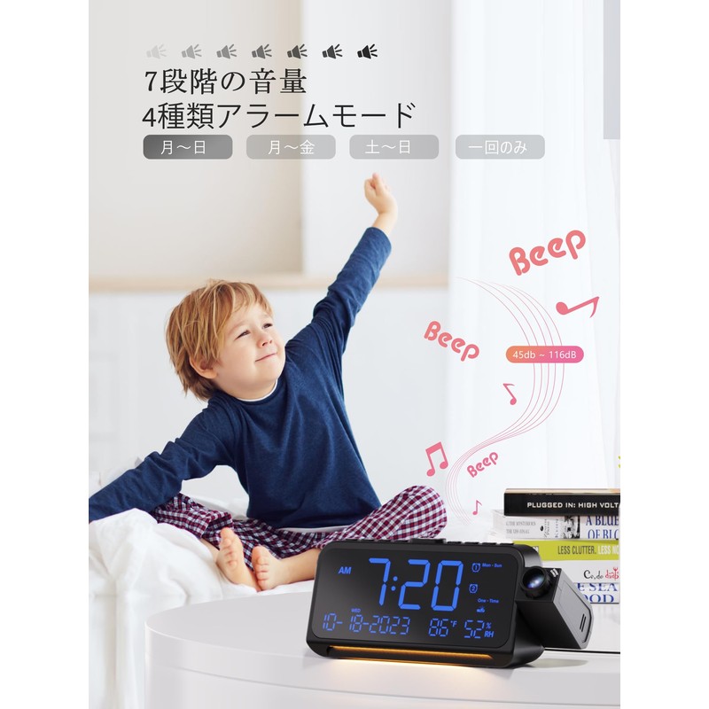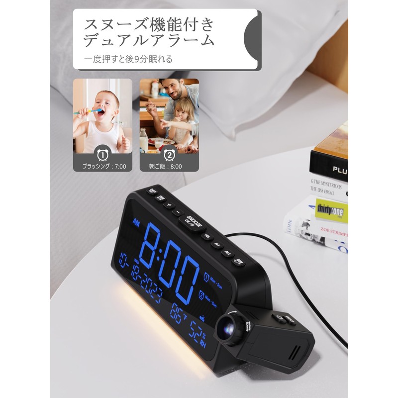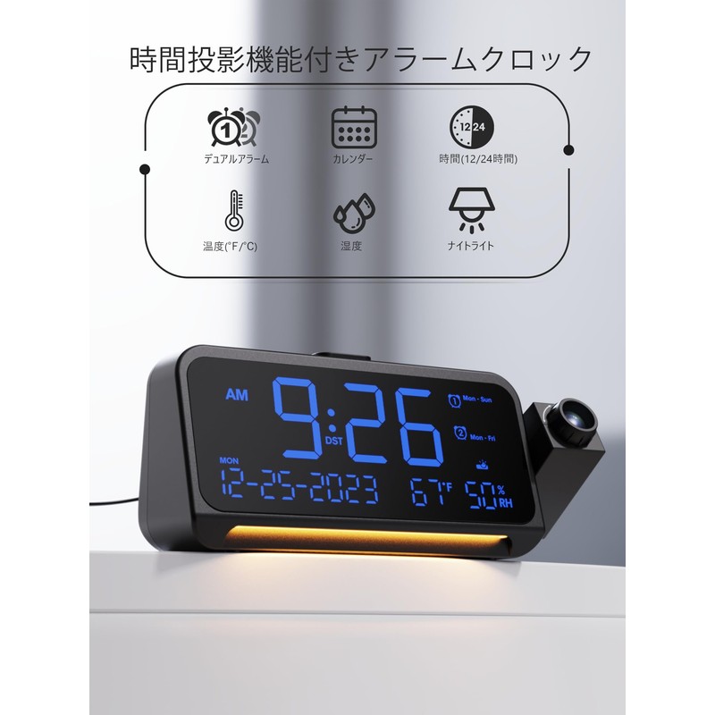 • (Display Functions at a Glance of Day and Time, Temperature, and Humidity) This ceiling projection clock has a large 5.9-inch LED display, so it can be seen anywhere and is a perfect tool for planning your day. Digital projector clock with thermometer and hygrometer provides accurate temperature and humidity measurement and is very useful in daily life. In addition, there are many functions such as 12/24 hour mode, calendar, and day display, so you can get a great value for one car
