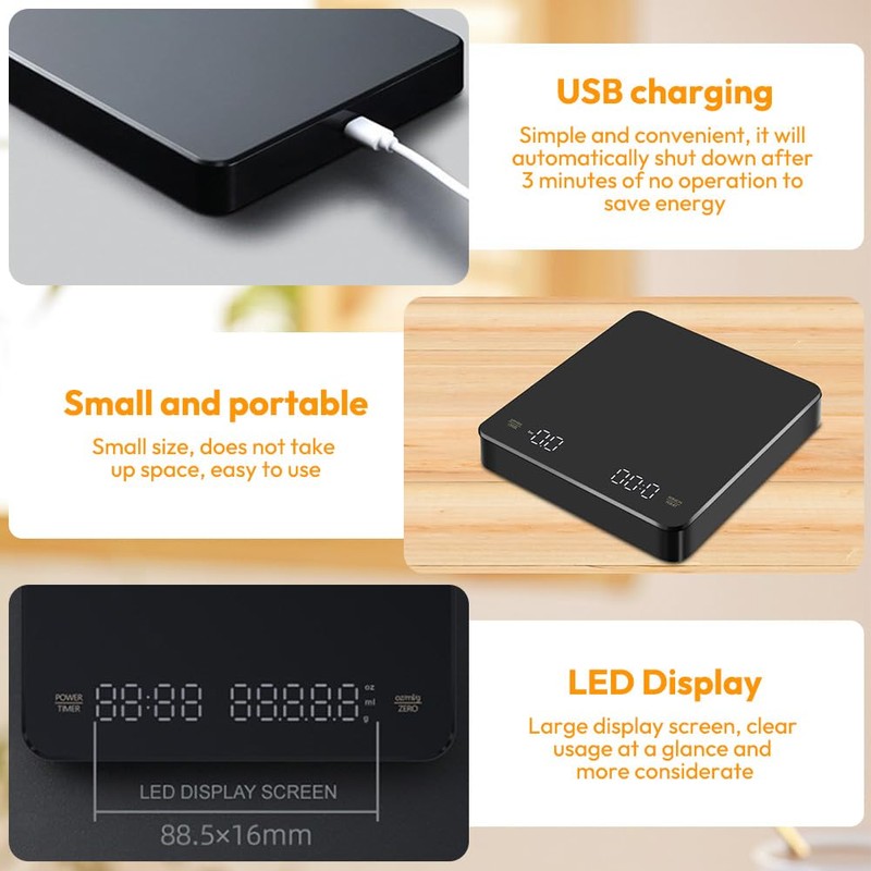 - COMPACT DESIGN SPACE SAVING This mini coffee scale is designed for modern coffee lovers. Its compact, palm-sized shape not only fits the coffee maker, but also saves more space than traditional electronic scales. The built-in rechargeable 250mAh lithium battery supports Type C fast charging and ensures you can enjoy high-quality coffee anytime and anywhere. After three minutes of inactivity, it automatically shuts off, effectively saving power and extending the service life.