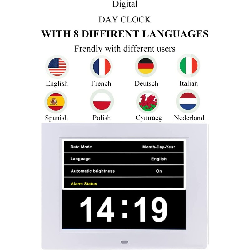 Digital Day Calendar Clock 8 Inch 12 Alarms Non-Abbreviations Day & Month Digital Clock for Elderly Dementia Alzheimer Vision Impaired Memory Loss